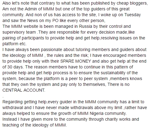 Chuddy Ugorji who is arguably MMM Nigeria's number 1 guider, has taken to his Facebook page to finally address the lingering issue of frozen accounts, three days after the ponzi scheme's website released the shocking news to its subscribers.