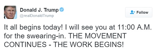 Hours before he is officially sworn in as President of the United States, Donald Trump has taken to Twitter to declare that “the work begins today.” The President-elect who is due to attend a private service at St John’s church in Washington DC with his family before the inauguration ceremony kicks off later today. Trump started his big day by tweeting “THE MOVEMENT CONTINUES – THE WORK BEGINS,” to his 20million followers.