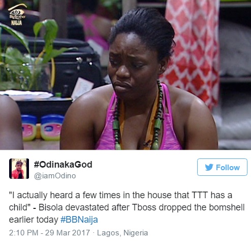 Bisola then had no choice but to cave saying of TTT, "we have a strong bond that will last a very, very long time!" Things then took a sudden turn as Bisola joked that TBoss and Bally were trying to force something that might never happen saying "How is she sure that he's not married?" She chuckled for a bit before TBoss responded "I actually heard a few times in the House that he has a child." Bisola's smile melted away and she sat still for a moment as the words washed over her.