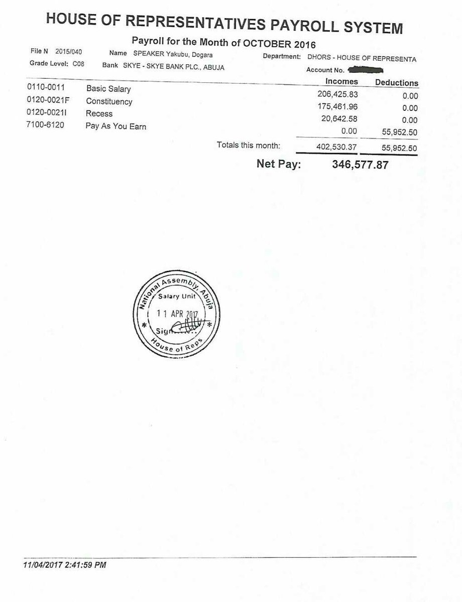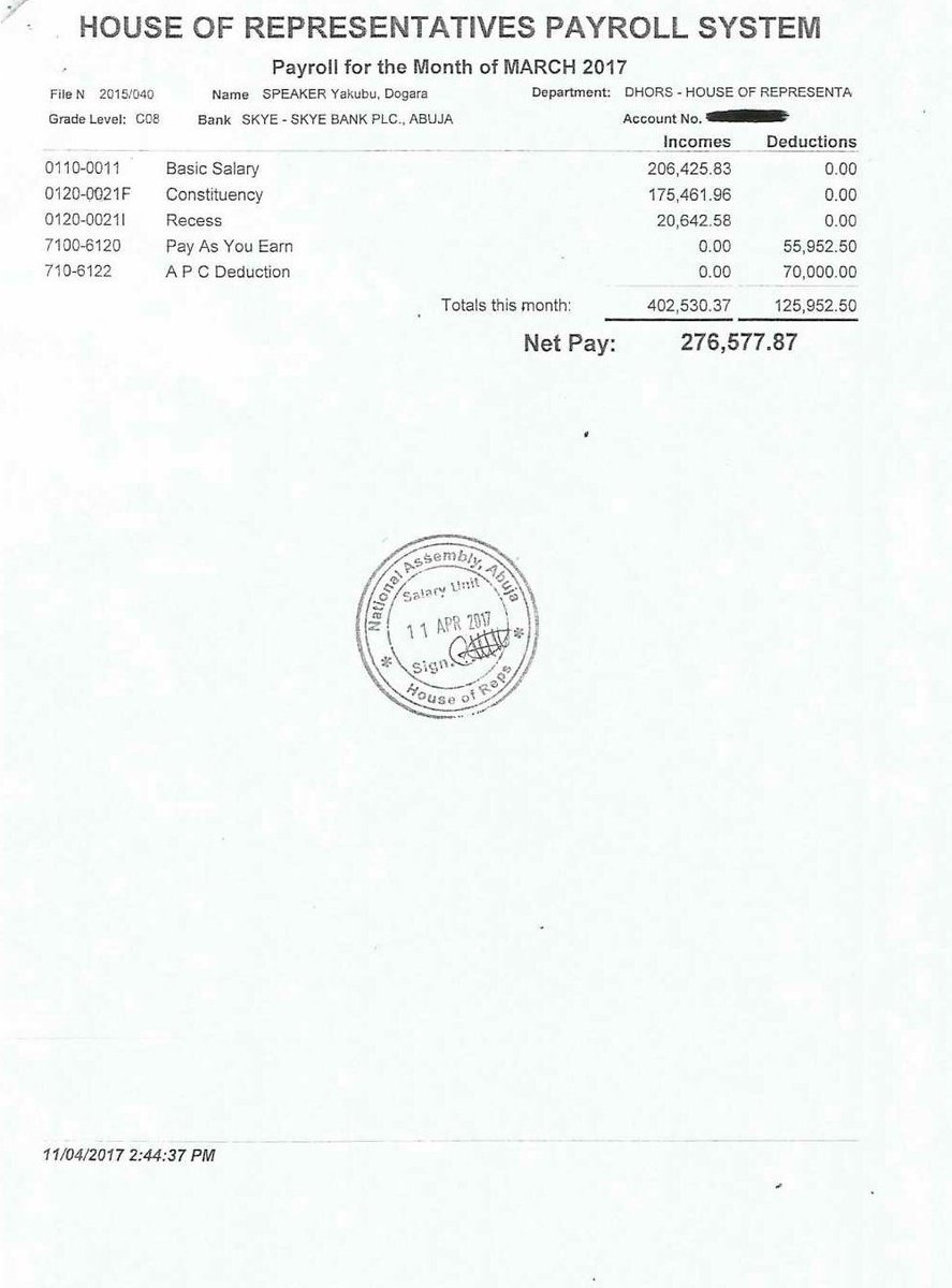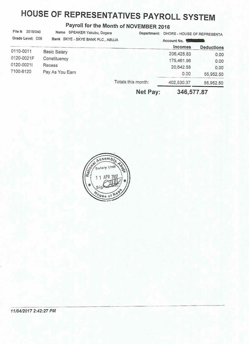 According to the documents, Dogara earns about N300,000 after tax deductions have been made. The release of the pay slips comes 24 hours after Nasir el-Rufai, governor of Kaduna, published the breakdown of his security vote among other items.