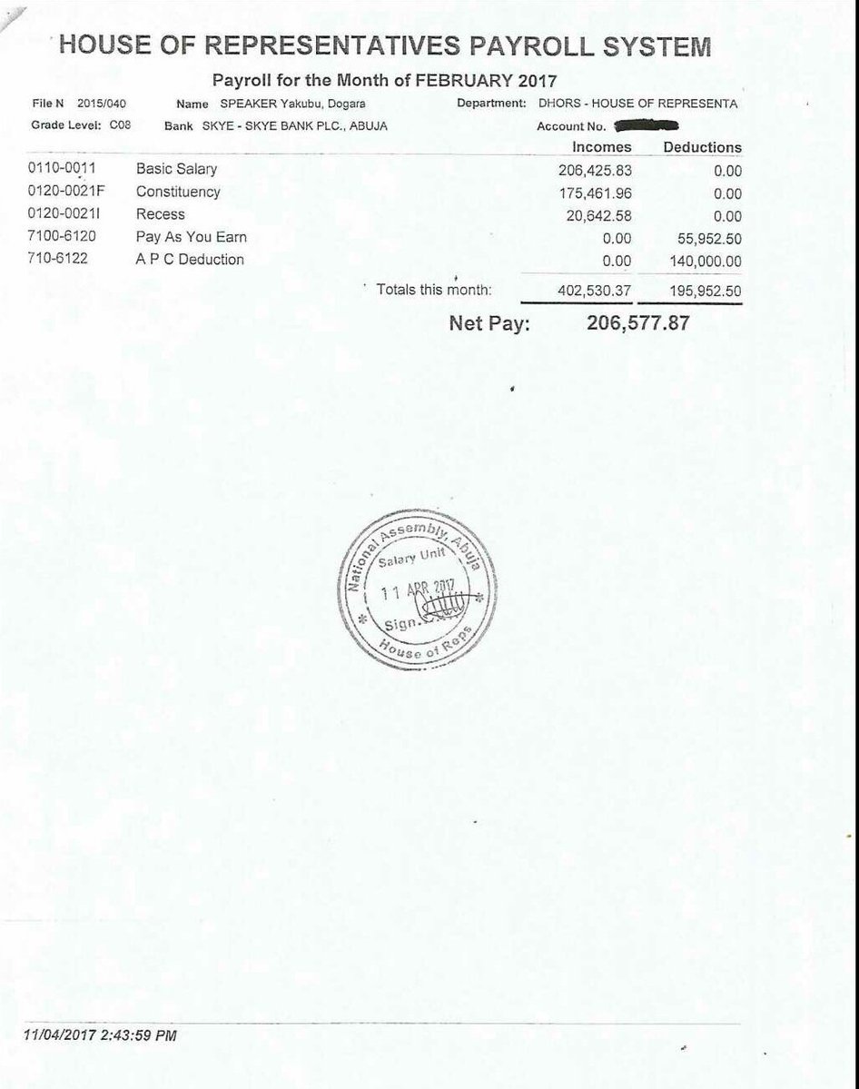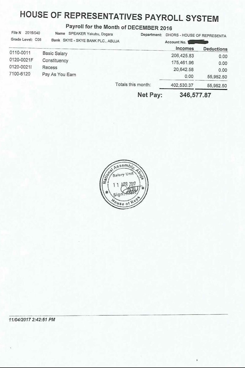 Speaker of the House of Representatives, Yakubu Dogara has released his pay slips for six months. The pay slips were on Tuesday released by Turaki Hassan, his spokesperson. However, the allowances earned by the lawmaker was not revealed.