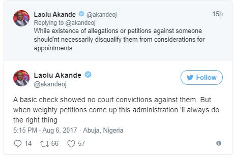 “While existence of allegations or petitions against someone shouldn’t necessarily disqualify them from considerations for appointments,” Mr. Akande said.