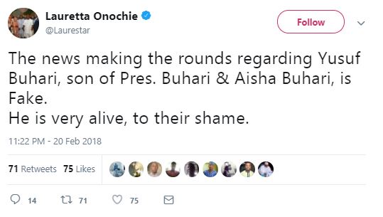 However, while reacting to the news, the President's Special Assistant on Social Media, Lauretta Onochie debunked the news. She wrote: "The news making the rounds regarding Yusuf Buhari, son of Pres. Buhari & Aisha Buhari, is Fake. He is very alive, to their shame."