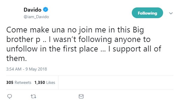 This has attracted a response from Davido who debunked the news on Twitter. He insinuated that he never followed him in the first place, urging people not to drag him into Big Brother Naija controversies.
